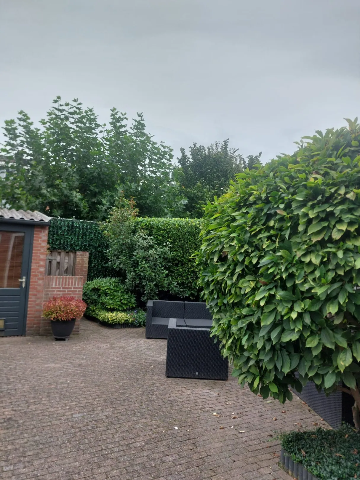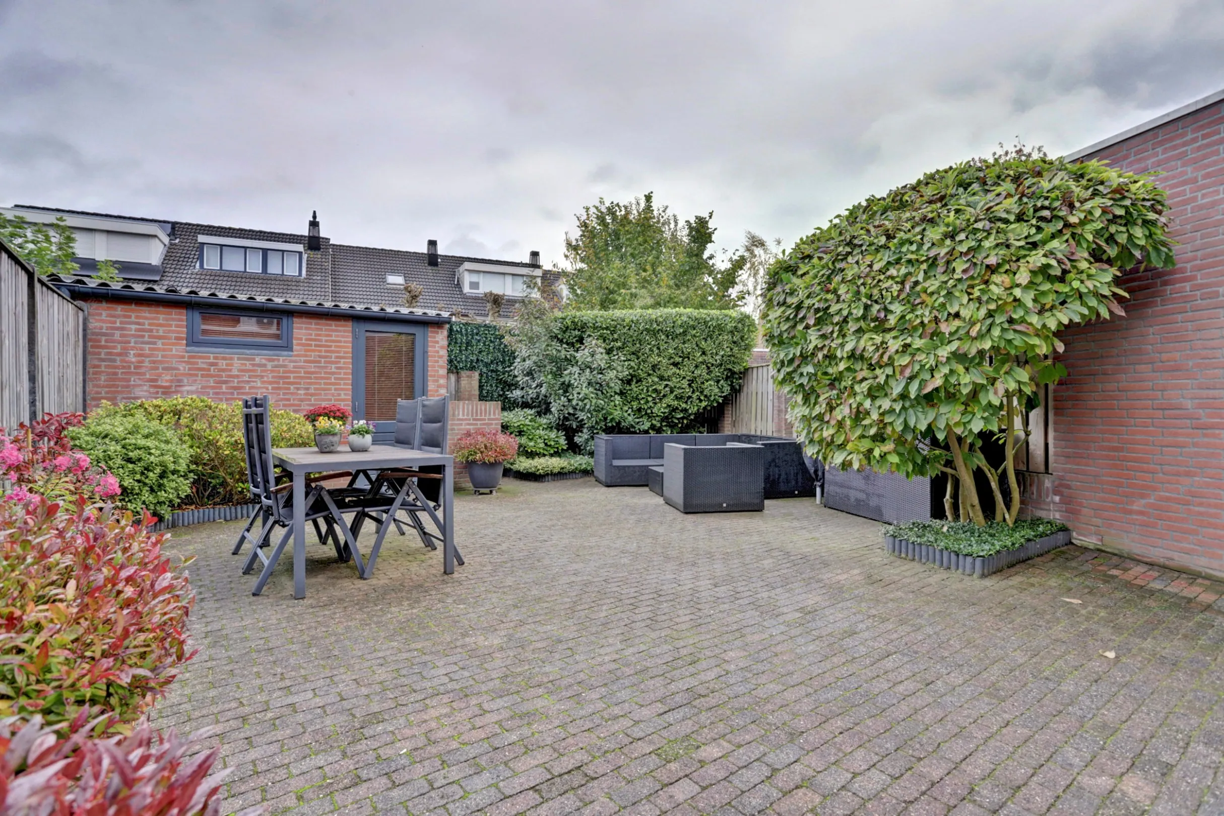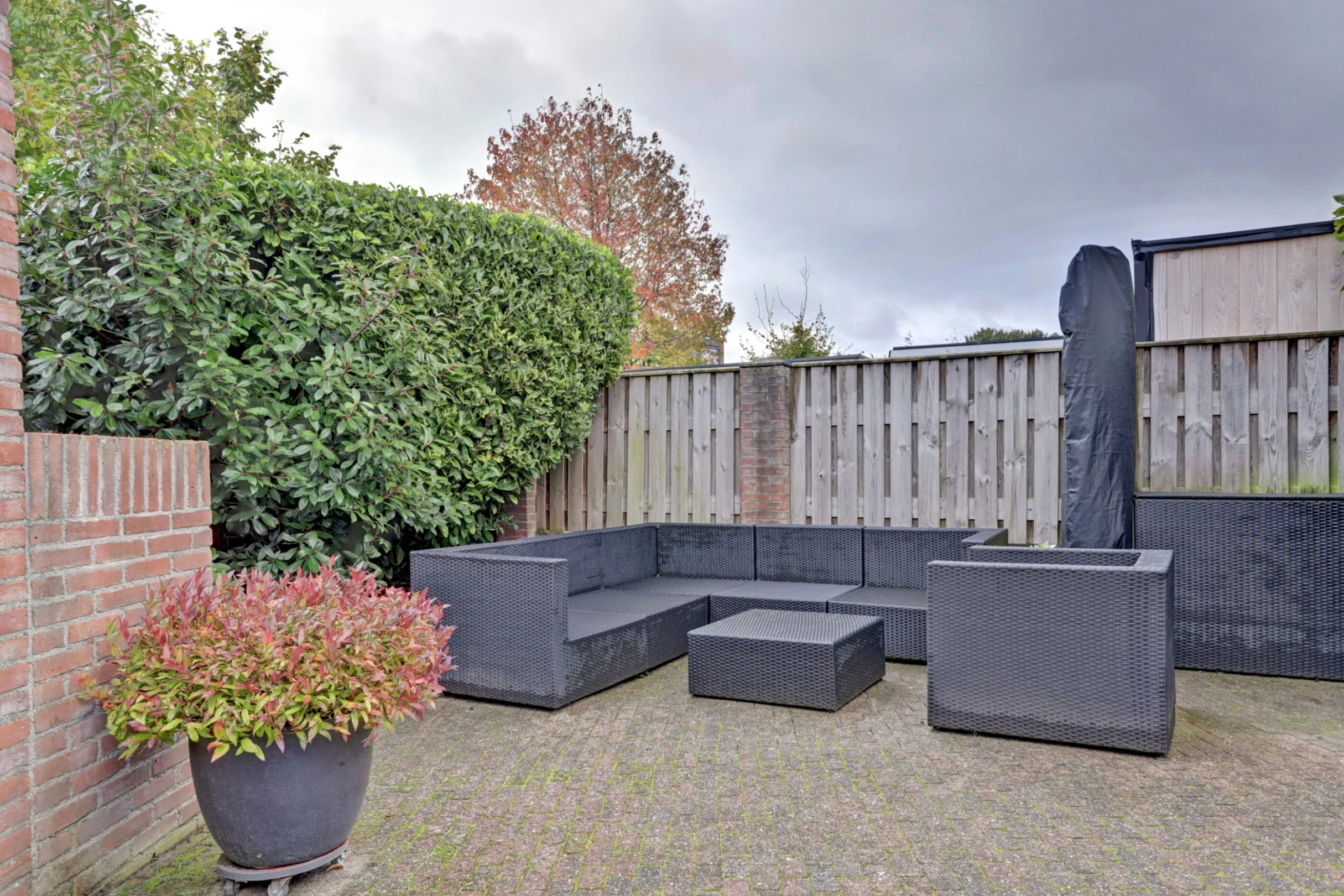 De tuin is netjes onderhouden en is gelegen op het oosten. Er is een stenen berging met elektra, een achterom en een buitenkraan.