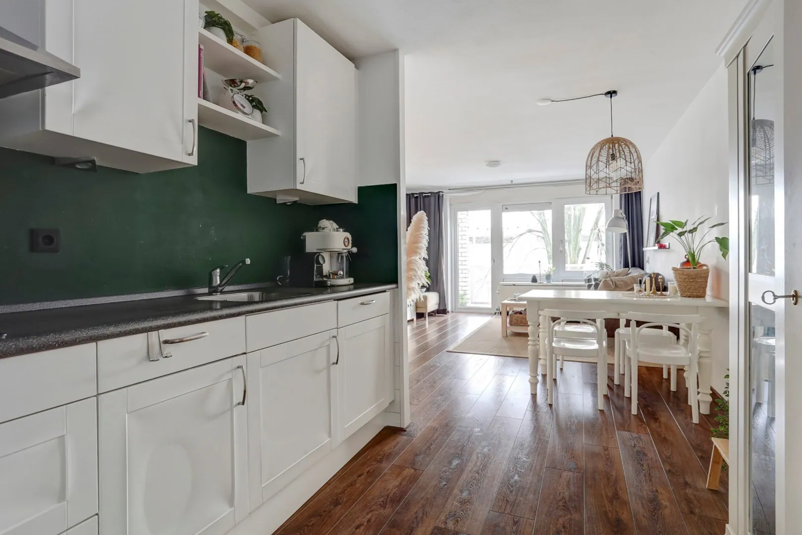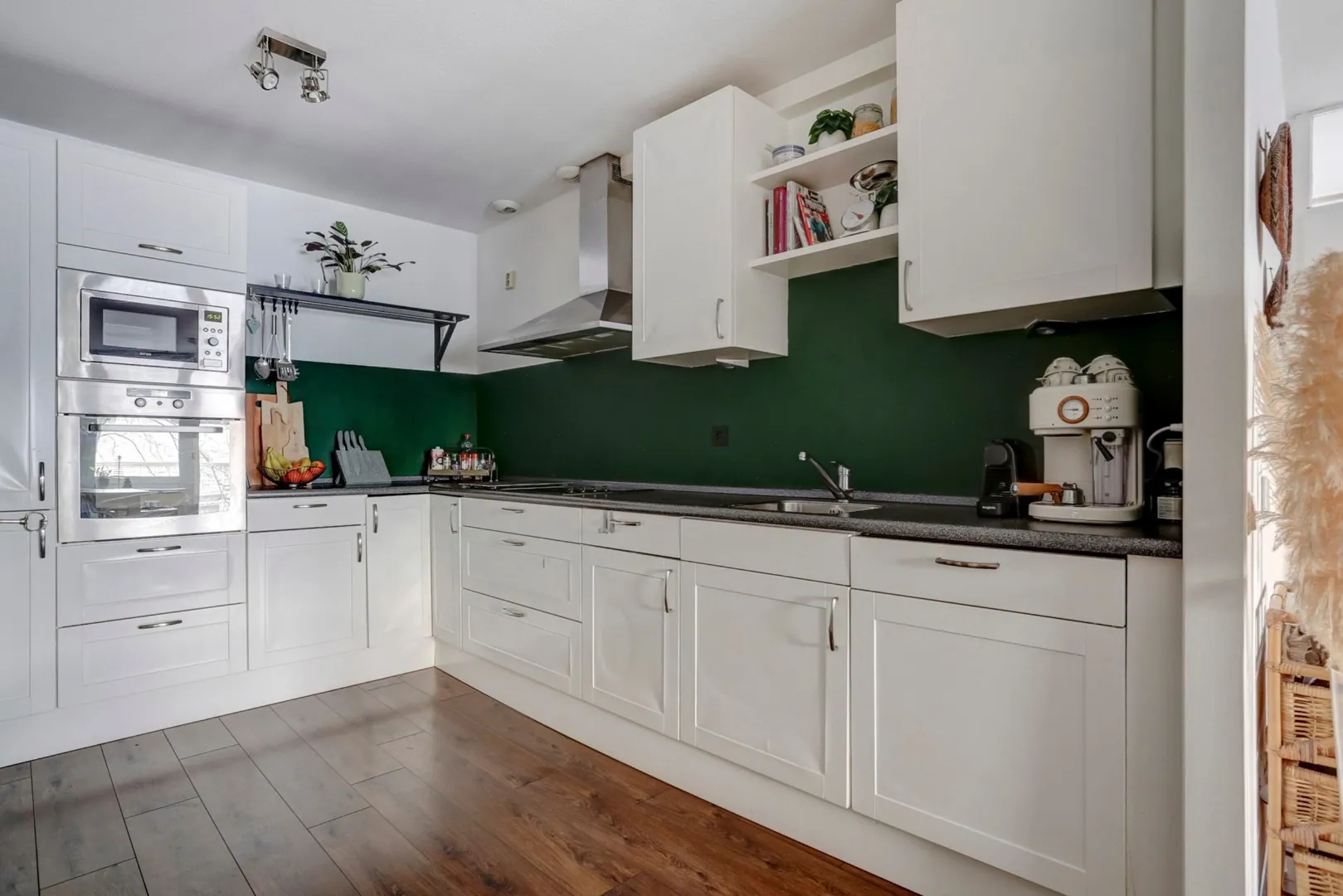 Open keuken voorzien van keramische kookplaat, rvs afzuigkap, oven, magnetron, koelkast, vriezer en vaatwasser.