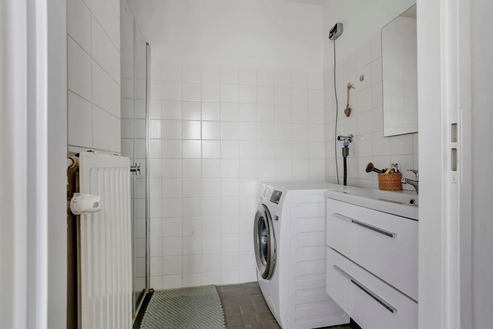 Badkamer voorzien van douche en wastafel, tevens de aansluiting voor de wasmachine.