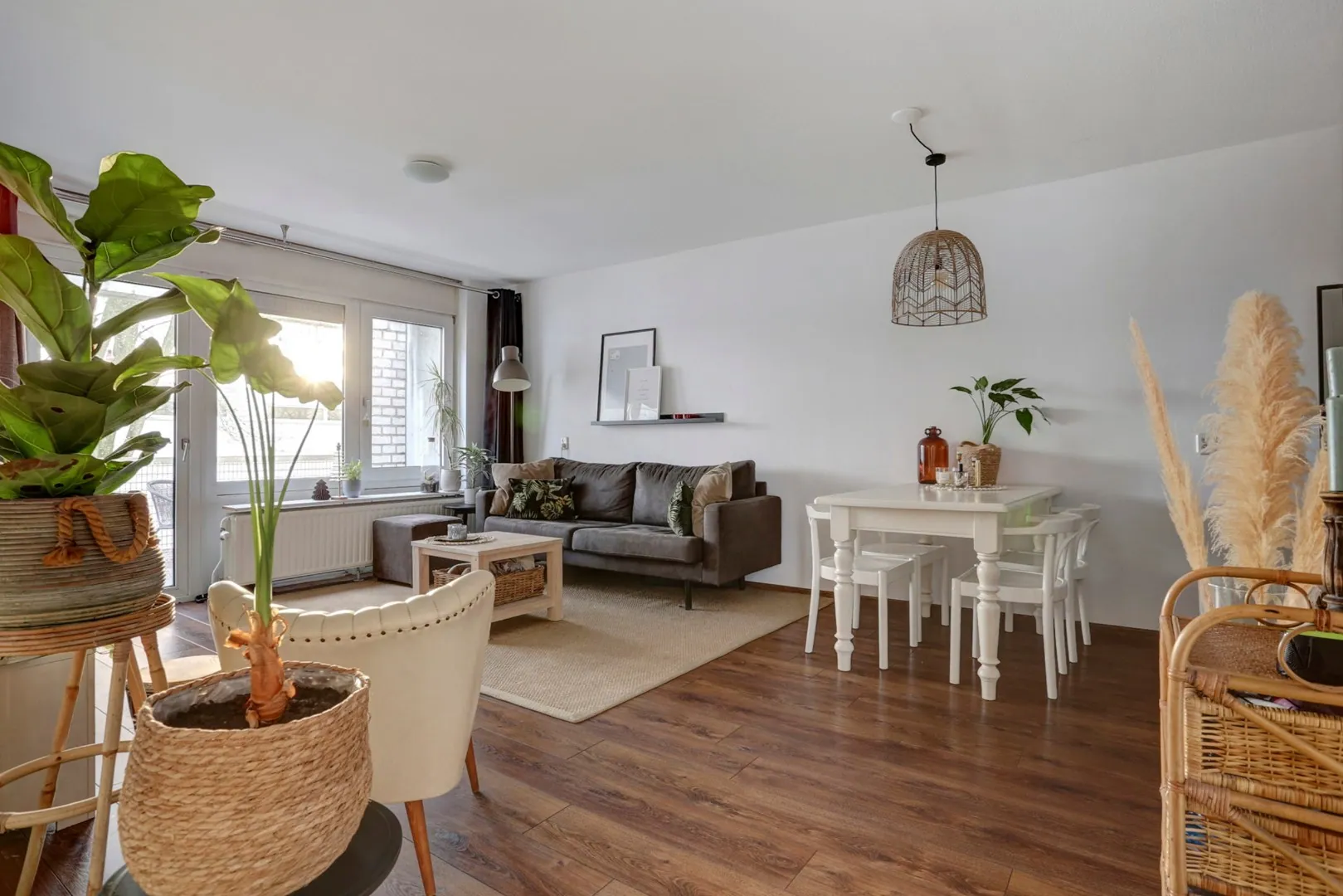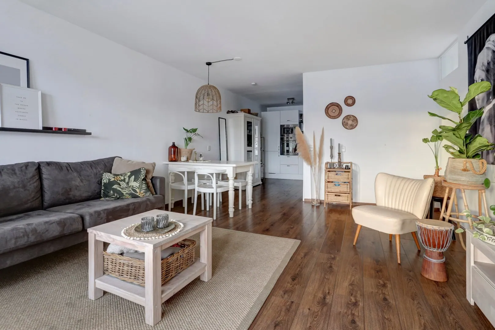Ruime lichte woonkamer (ca 32m² ) voorzien van laminaatvloer en een balkon.
