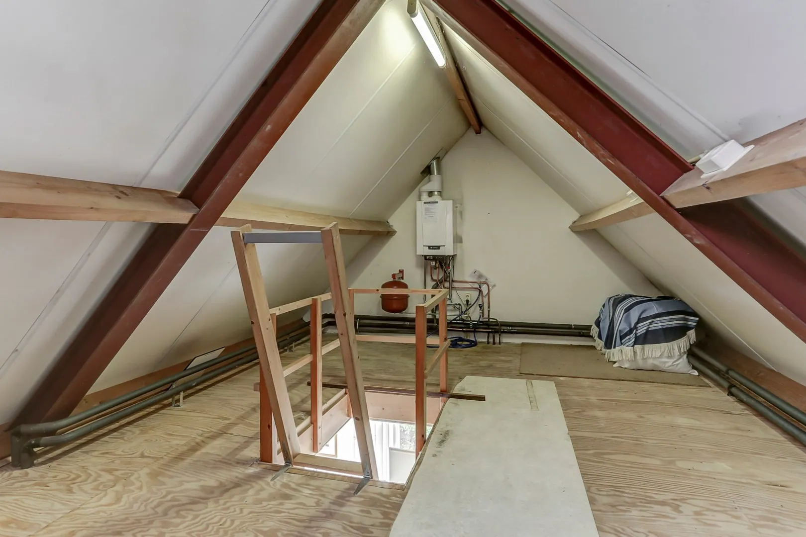 Via vlizotrap te bereiken ruime bergzolder met opstelling Hr-combiketel ( ca 2019 ).