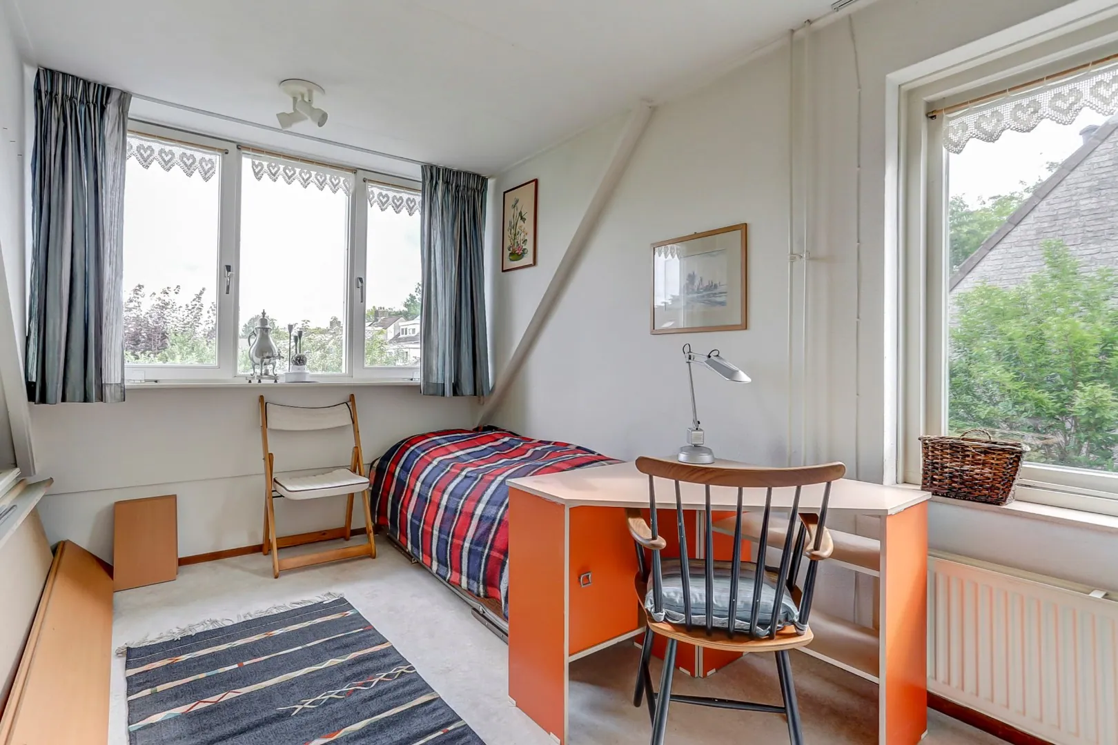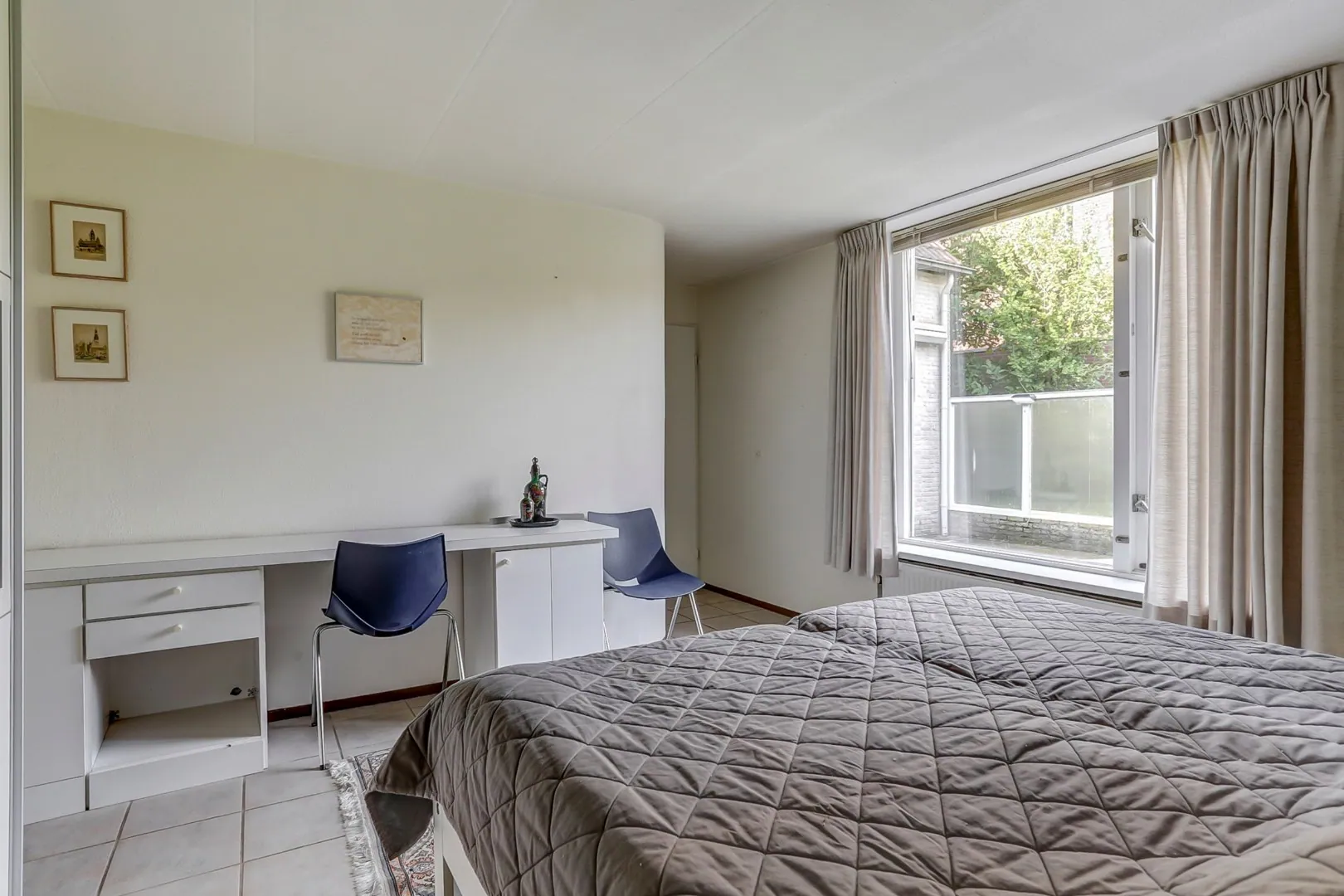 De woning beschikt over een ruime slaapkamer op de begane grond en 2 slaapkamers en een badkamer op de 1e verdieping.