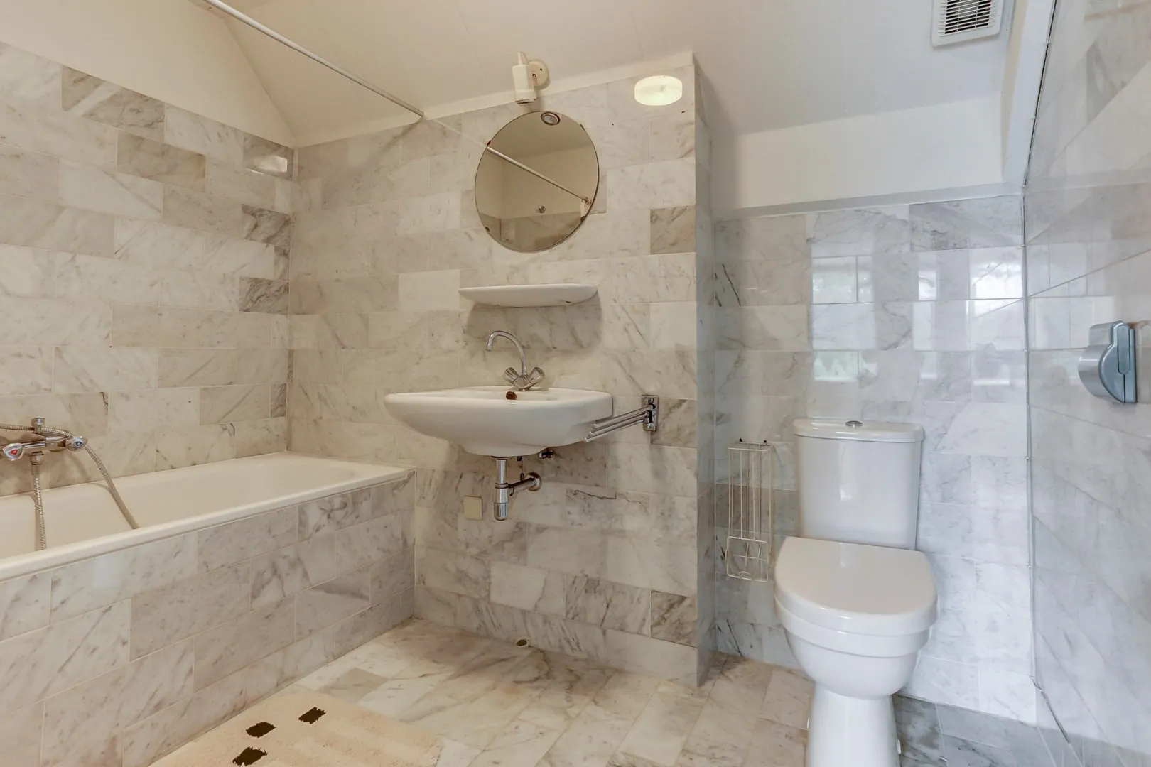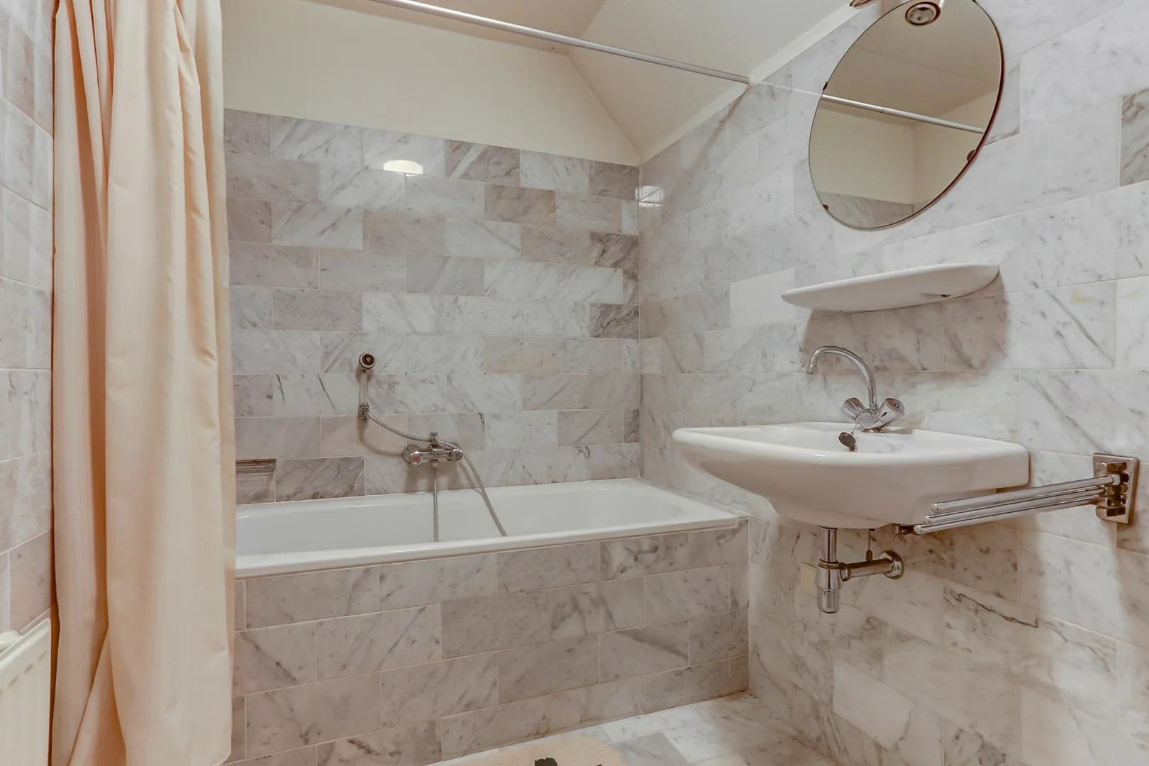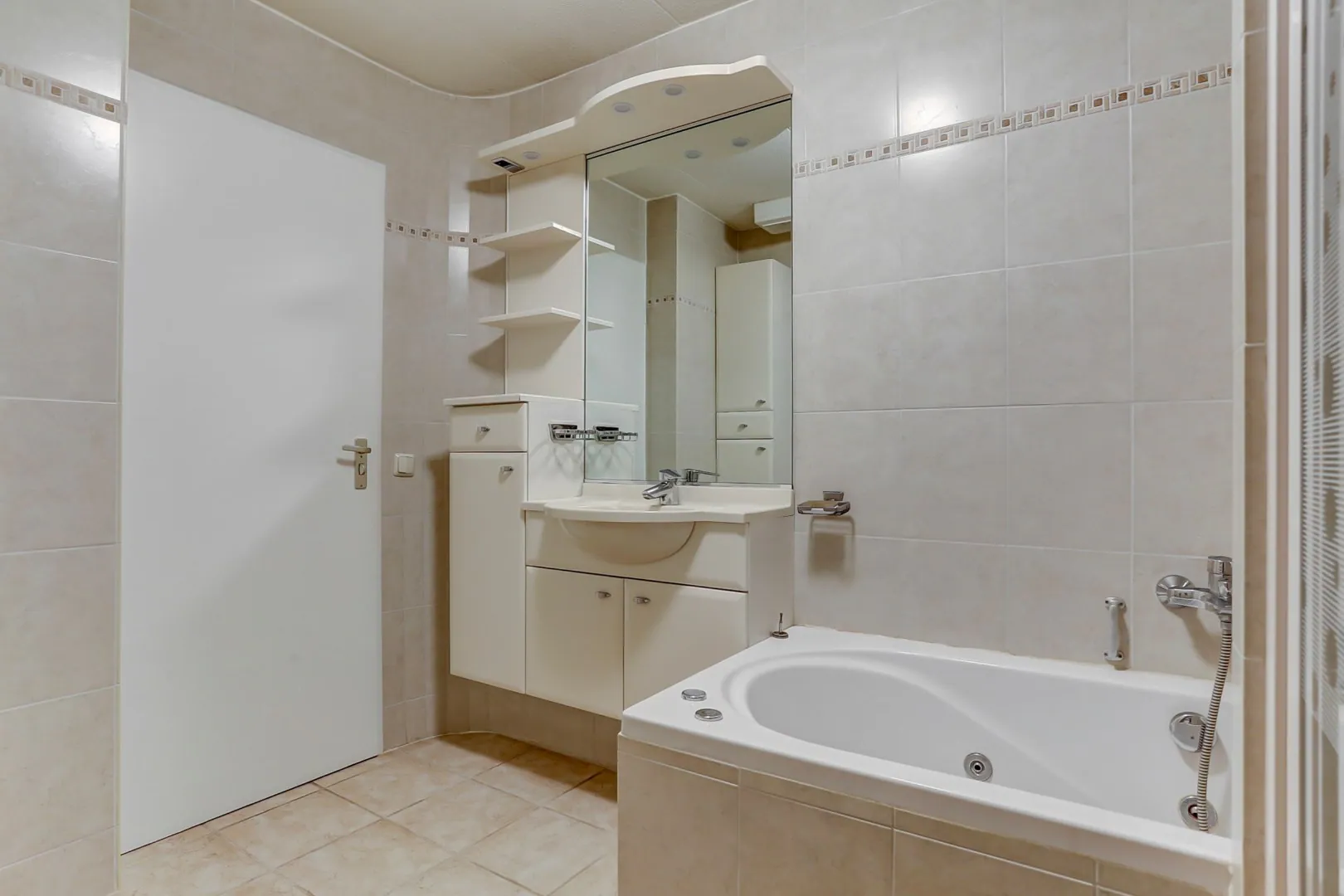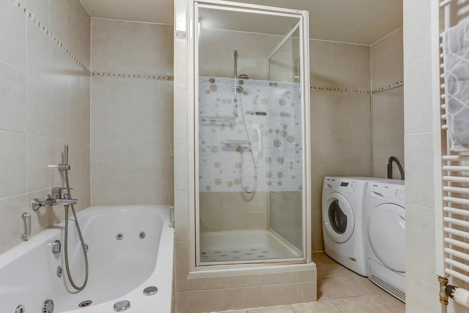 Badkamer voorzien van douchecabine, ligbad en wastafelmeubel.