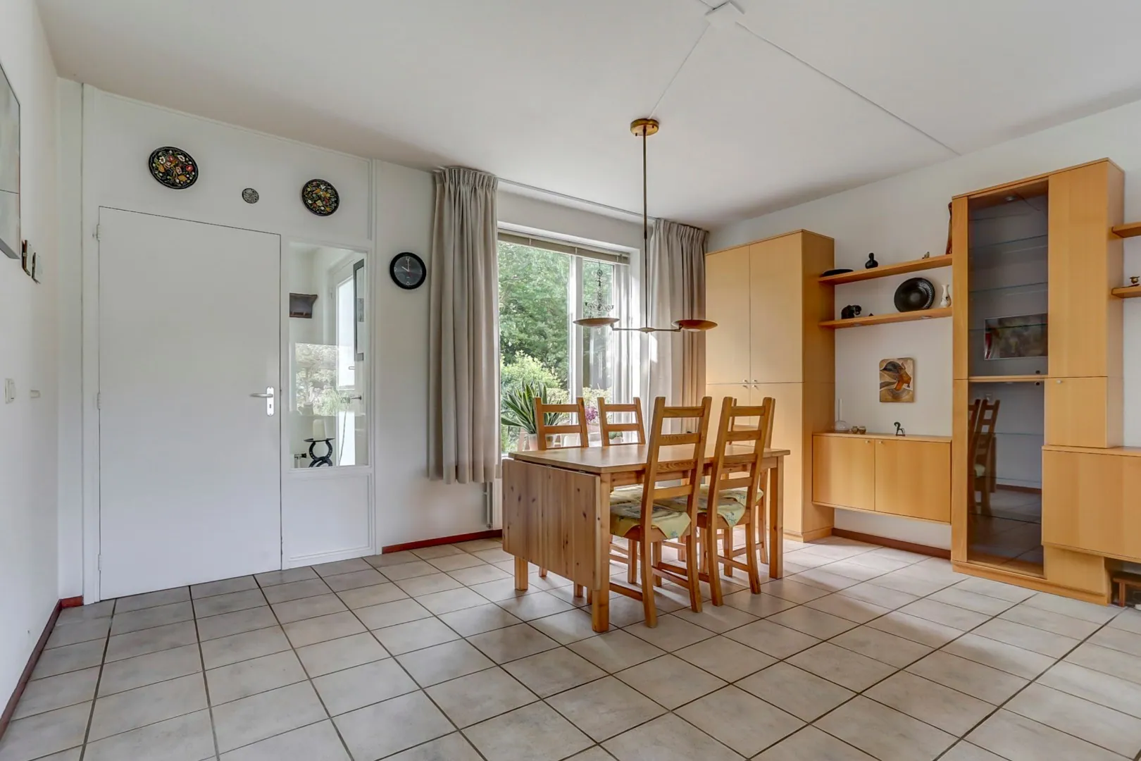Ruime woonkamer ( ca 40 m² ) voorzien van tegelvloer en schuifpui naar de fraaie ruime tuin.