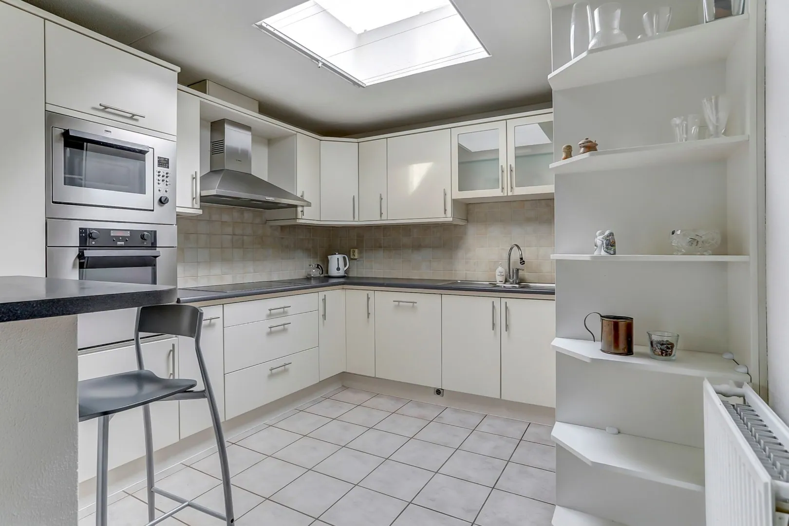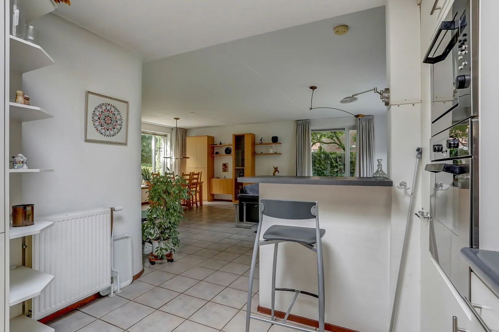 Open keuken voorzien van inductie kookplaat, afzuigkap, oven, combimagnetron, koel/vries combinatie en vaatwasser.