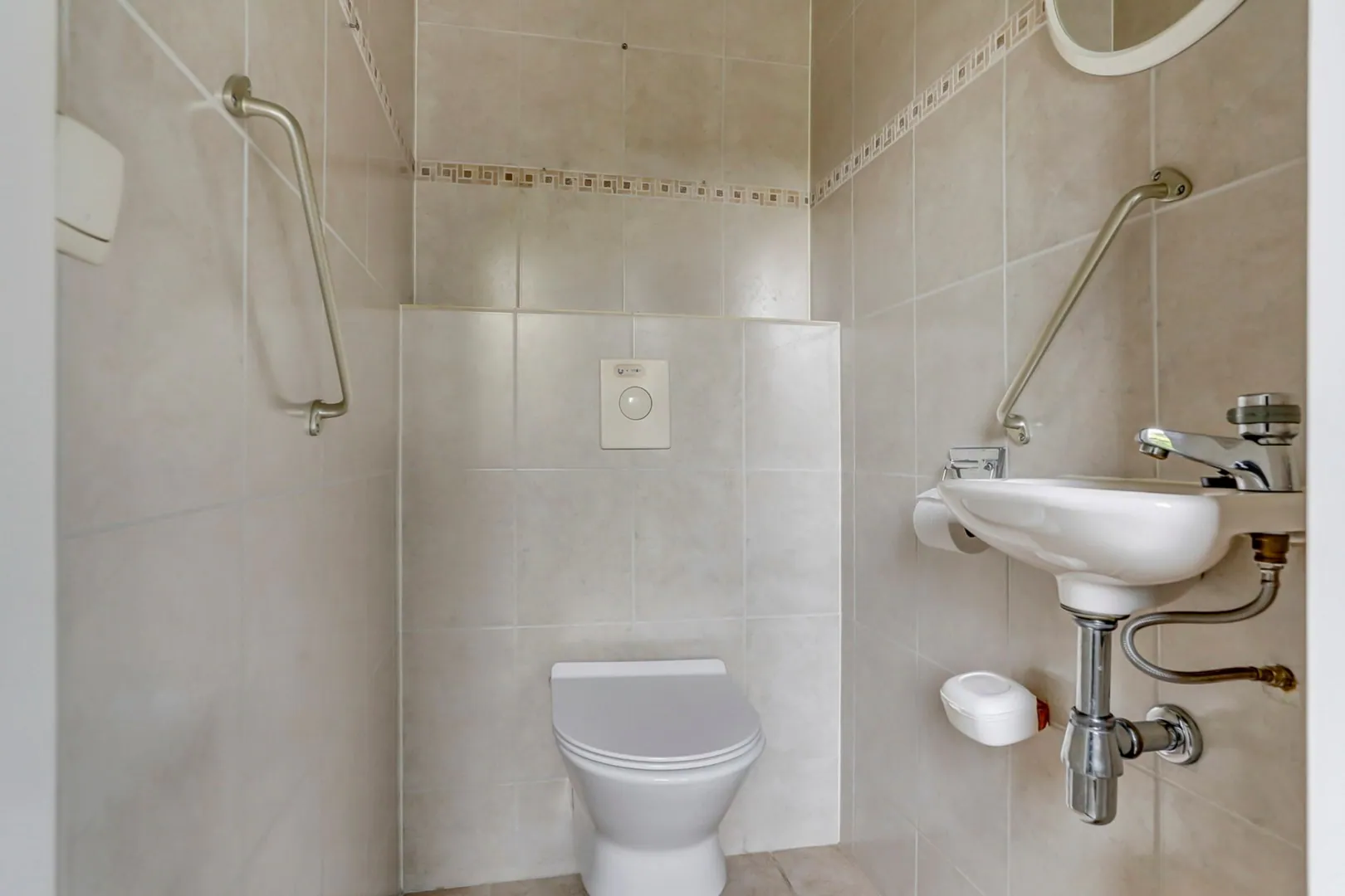 Badkamer voorzien van ligbad, toilet en wastafel.