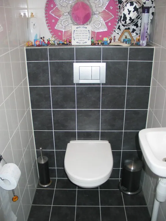 De hal geeft verder toegang tot het fraai betegelde toilet (zwevend) met fontein.